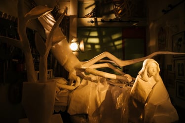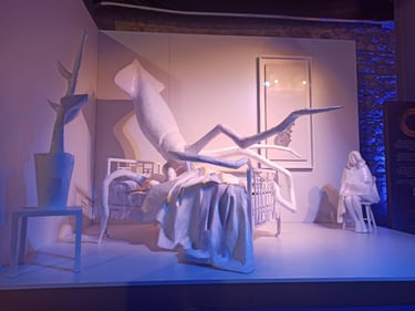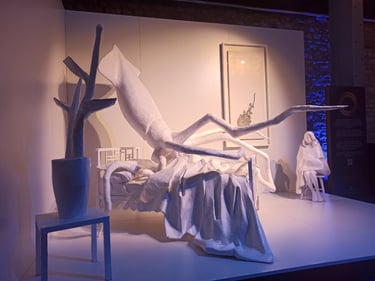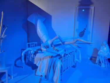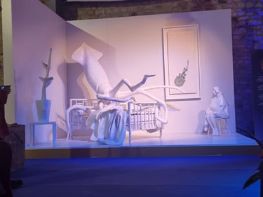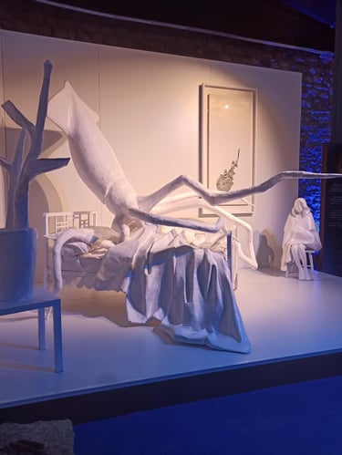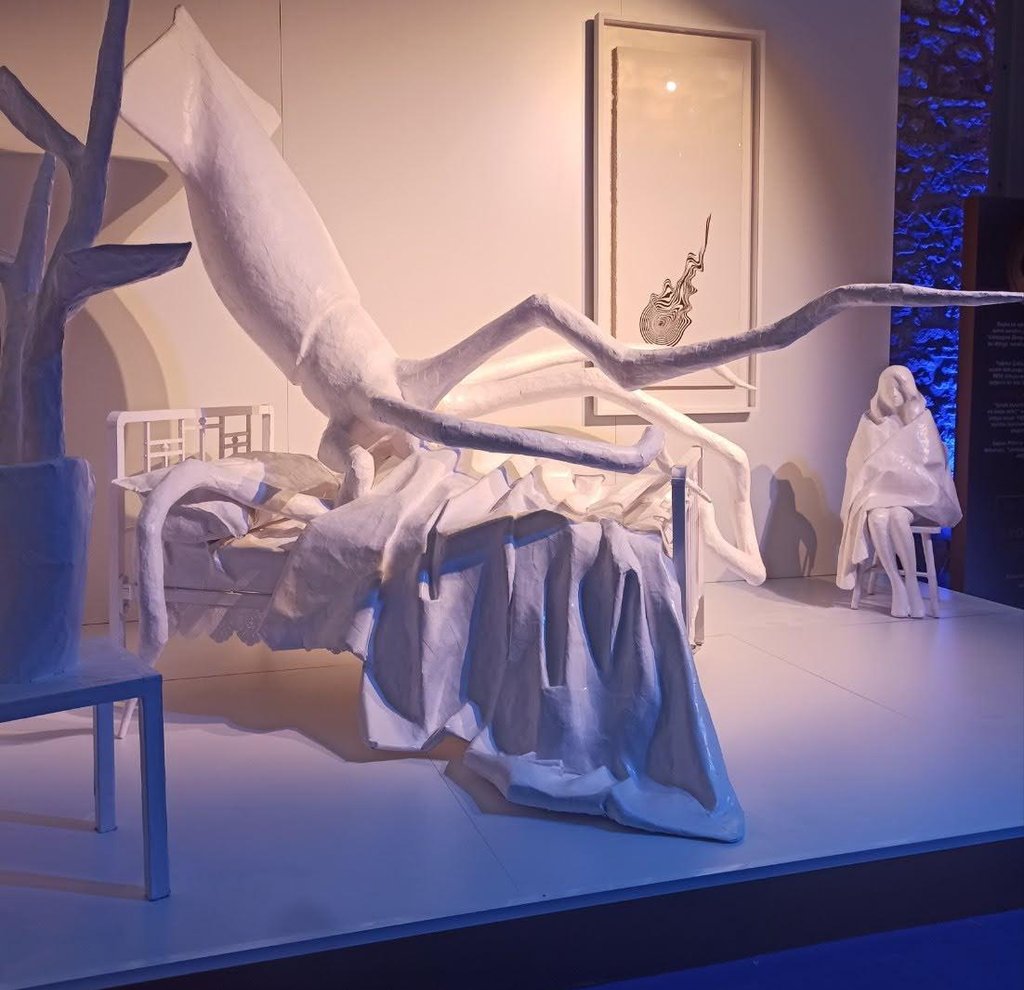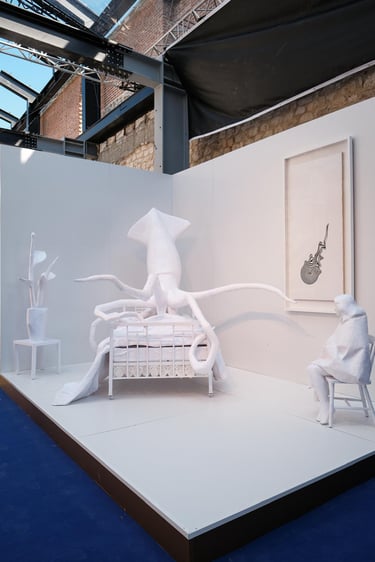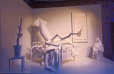 The bed is no longer a site of rest, but of occupation. Lying upon it is a squid, whose expansive, shape-shifting body functions as both a threat and a witness. Through its ability to spread, adapt, and infiltrate its surroundings, the squid becomes a metaphor for defense mechanisms, invisibility, survival, and trace-making. Ink, in this context, signifies both concealment and the unavoidable evidence of presence.
