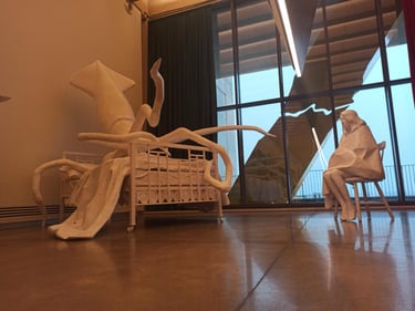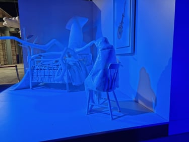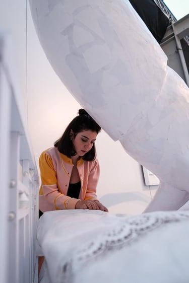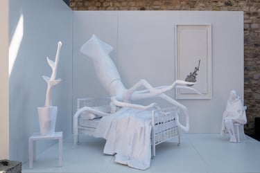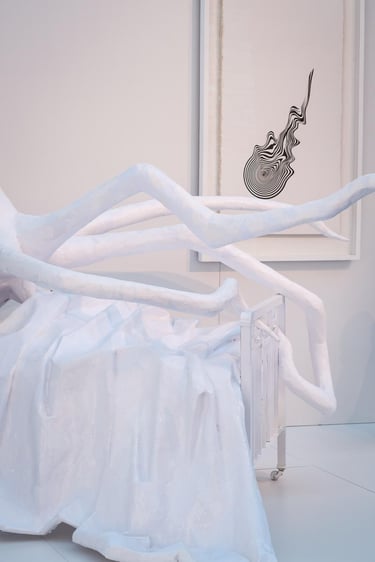 I constructed an entirely white room. Here, whiteness does not signify purity or emptiness, but rather sterilization, suppression, and erasure. The space recalls a bedroom — a place traditionally associated with safety and intimacy — yet its order has been disrupted and its functions displaced. For this reason, the room feels less like a dream and more like a nightmare.